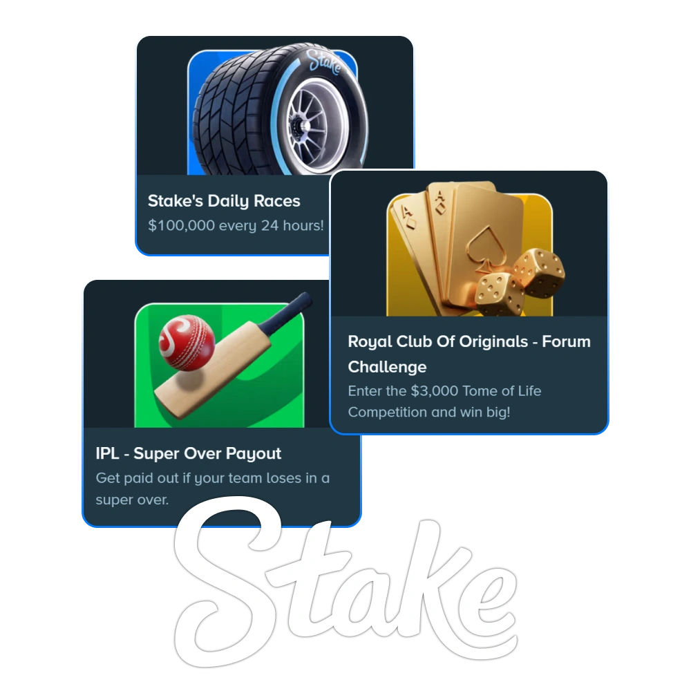 Stake updates its promotions on a regular basis and includes offers for sports popular in India. The list changes over time, so it is worth visiting the Promotions section to see what is currently available.