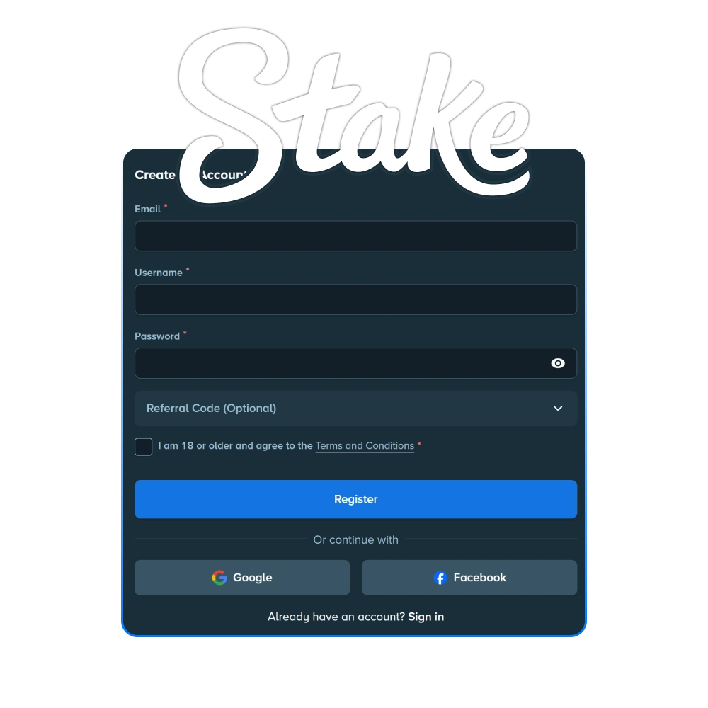 To start betting or playing casino games on Stake, every user from India must create a personal account. Registration gives you access to deposits, promotions, sports betting, and casino games. Only players who are 18 years of age or older can successfully sign up and verify their account at Stake.